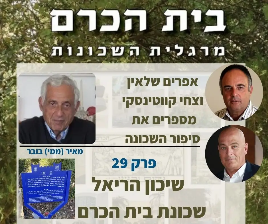 להאזנה לפודקסט לצפייה בפודקסט בפרק זה, צחי קווטינסקי ואפרים שלאין פוגשים את מאיר (ממי) בובר, בן השכונה שגדל בשיכון הראל – אחד המתחמים ההיסטוריים והמיוחדים של בית הכרם. ביחד הם