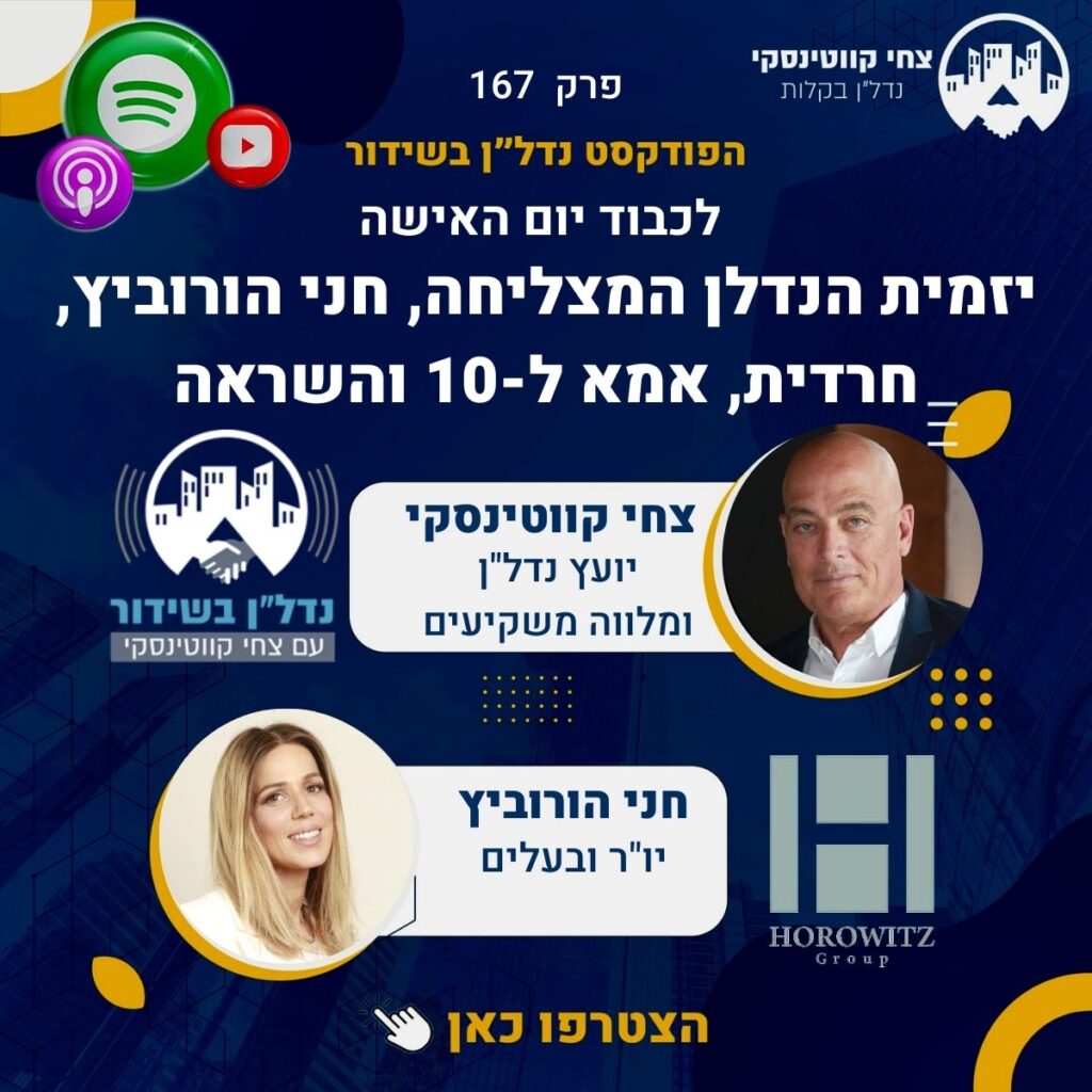 להאזנה לפודקסט לצפייה בפודקסט בפרק 166, בפרק השראה לכבוד יום האישה, אני מארח את חני הורוביץ, היו"ר והבעלים של קבוצת הורוביץ. קבוצת הורוביץ, היא קבוצת נדל"ן יזמית אשר בונה אלפי […]