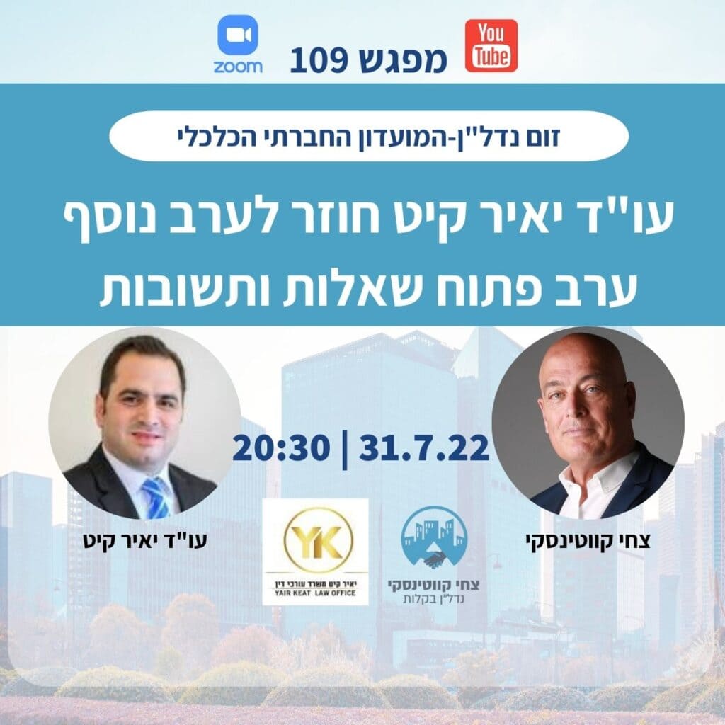 בסיום מפגש 107 פנו אלי רבים מהמשתתפים ובקשו כי עו"ד יאיר קיט, ישוב בהקדם, על מנת לענות על שאלות רבות עם דגש על התחדשות עירונית. ואכן, אמש, 31.7.22 אירחתי שוב […]